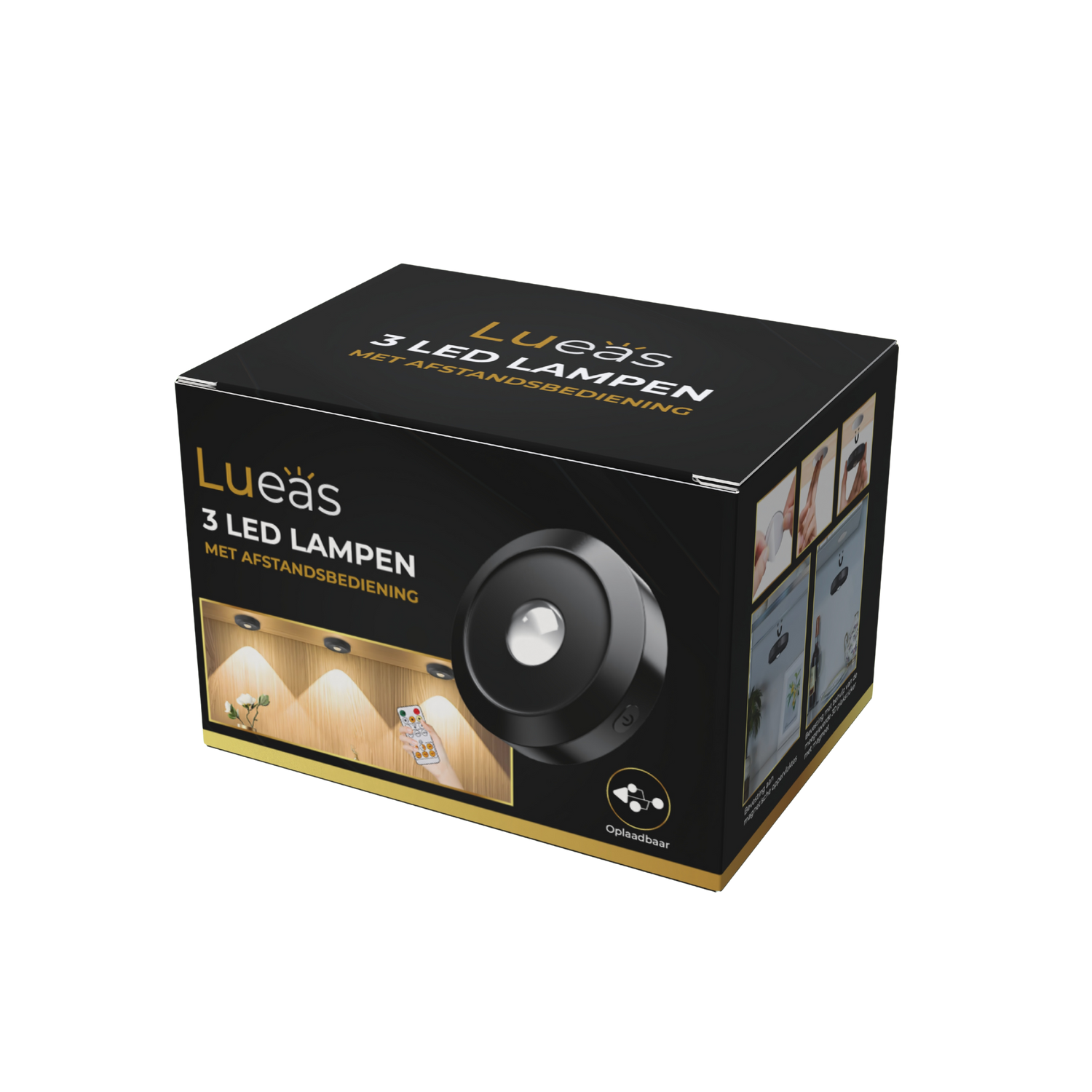 Met de Lueas® oplaadbare LED puck lights verlicht je eenvoudig donkere plekken in huis. Deze set van 3 draadloze LED lampjes is ideaal voor gebruik onder keukenkastjes, in kledingkasten, vitrines, trappen of als nachtlampje. Dankzij het compacte design en de eenvoudige montage plaats je ze overal, zonder boren of kabels.